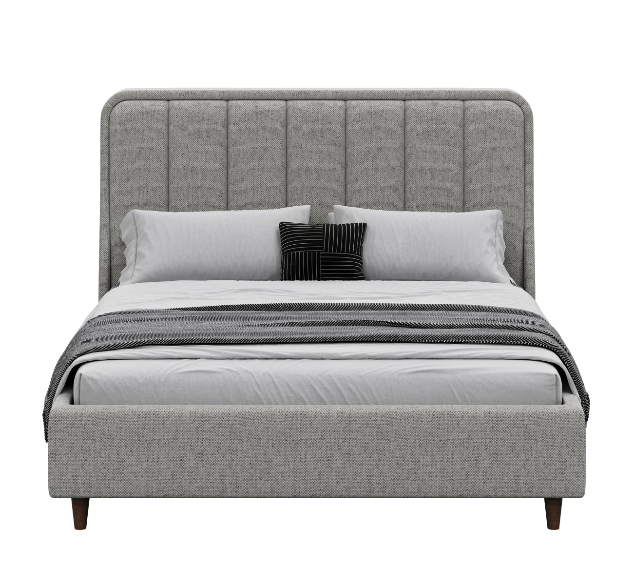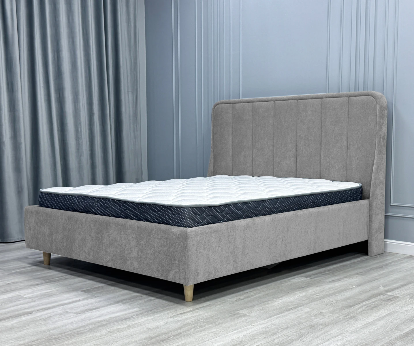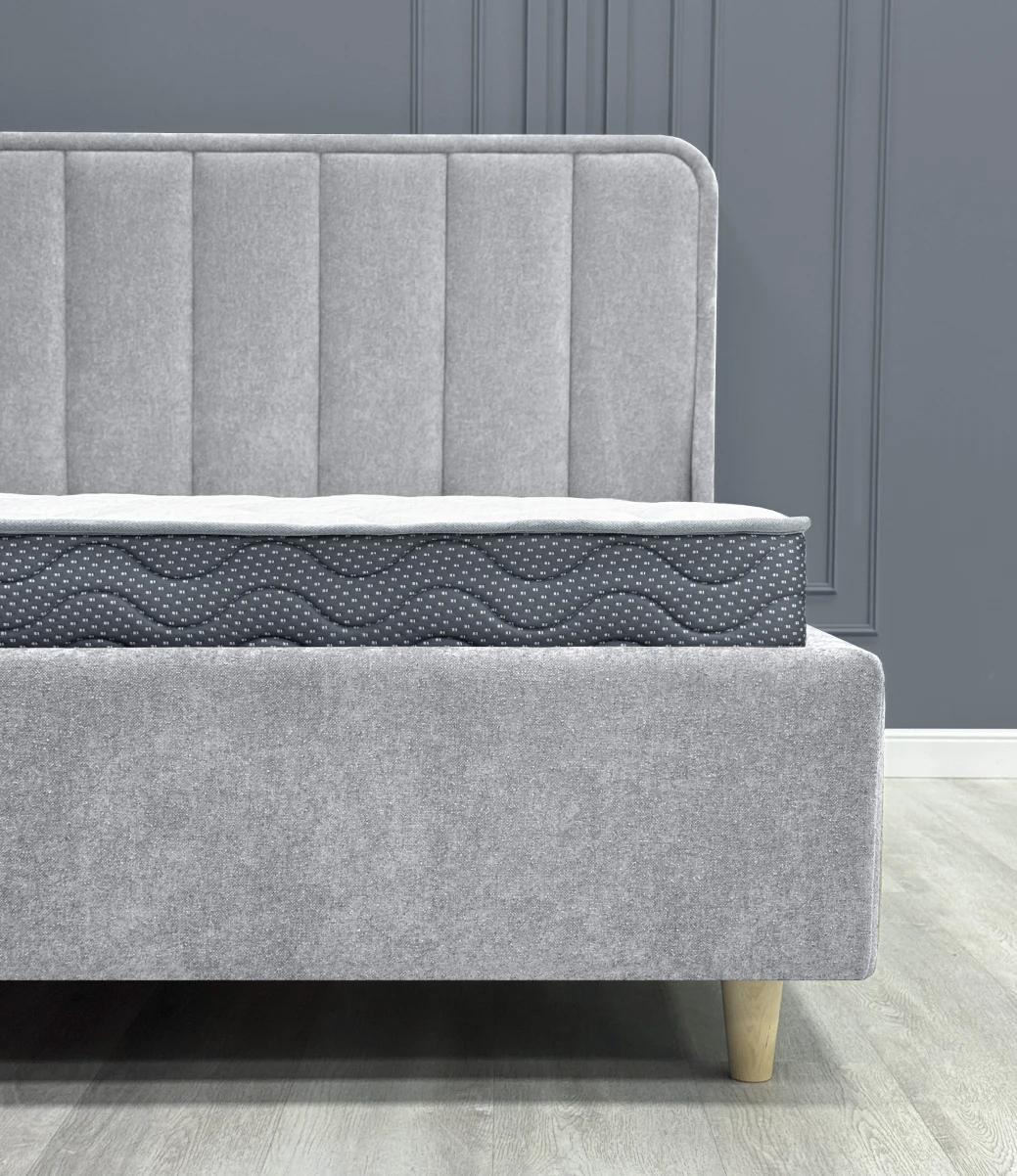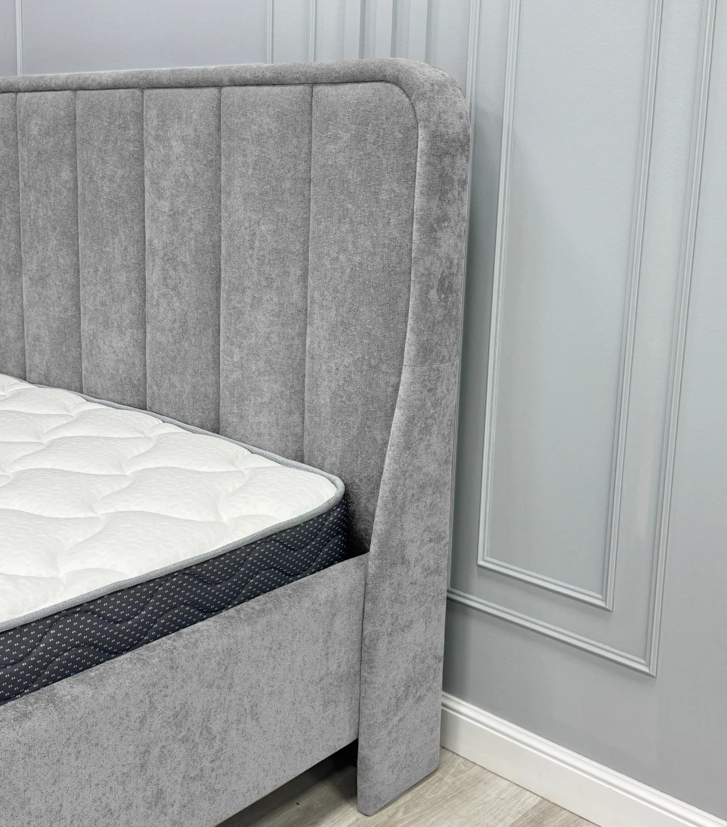 Дизайн изголовья формируется из округлой рамки и отдельных вертикальных вставок, которые изготавливаются и обтягиваются отдельно. Благодаря такому сочетанию все элементы изголовья имеют ярко выраженную выпуклую форму, что придает кровати премиальный внешний вид. Объемные мягкое изголовье