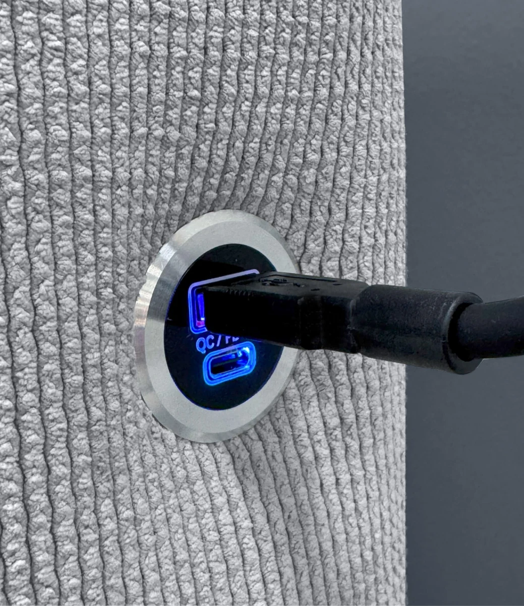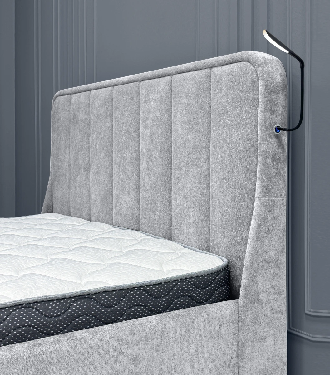 Интерьерная кровать «Milena 2» - трендовая модель выполненная в популярном дизайне с округлыми формами и отдельными пышными вставками с вертикальной прямой геометрией. Возможность дополнительного оснащения: разъем с подсветкой с USB и Type-C разъемами для быстрой зарядки устройств прямо в кровати и LED-светильник с 3 режимами освещения на гибкой основе для максимально комфортного освещения.