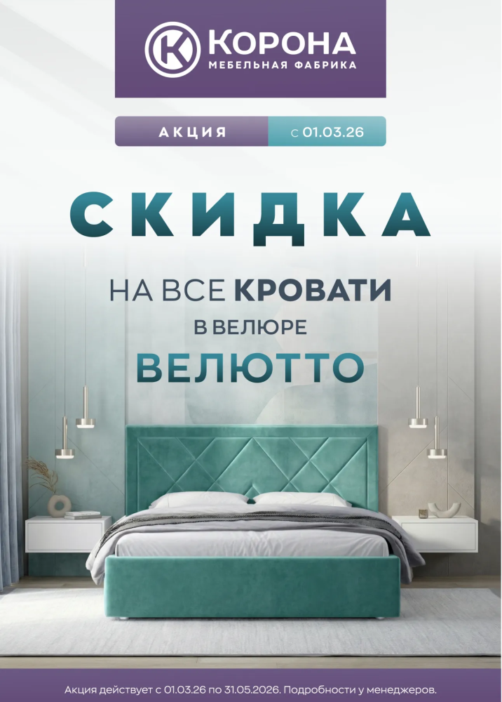 - Скидка распространяется на все кровати ТМ «Корона» в ткани «Velutto»